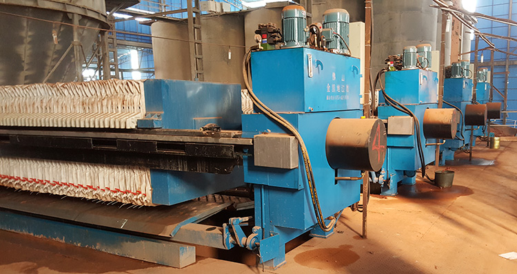 1. 液壓缸推動濾板將其壓緊,在濾板間形成密閉的濾室,污泥經由入料泵打入這些濾室,在壓力的作用下脫水。